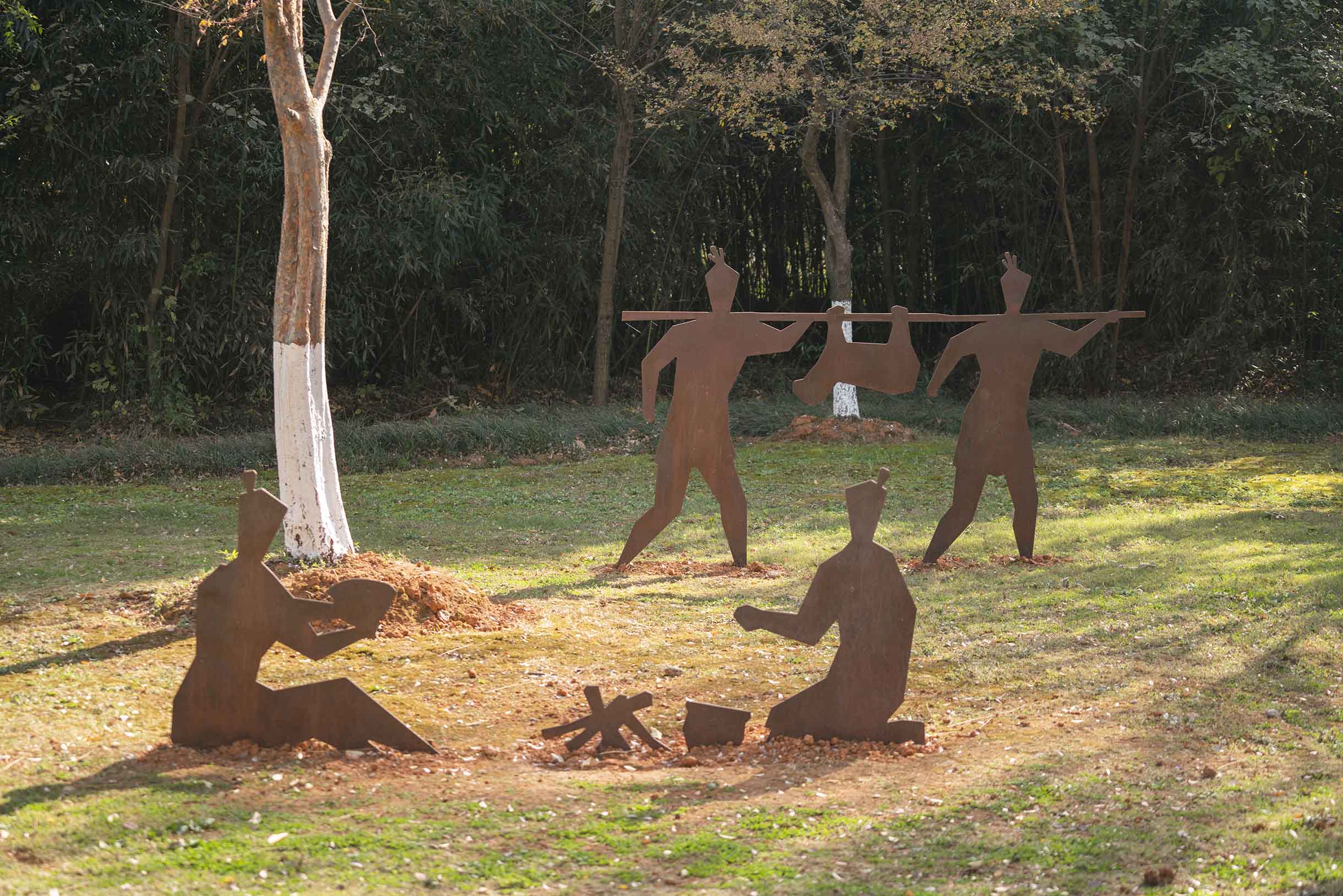 考虑到盘龙城遗迹的历史背景和盘龙城遗址博物馆的整体风格,我们以夯土、木纹和古铜色不锈钢作为标识的主要材料及设色,在体块的材料差异中进行穿插和挪移,体现出不同材料间的代际差异,同时展现出博物馆的当代特质和历史的文化线索。