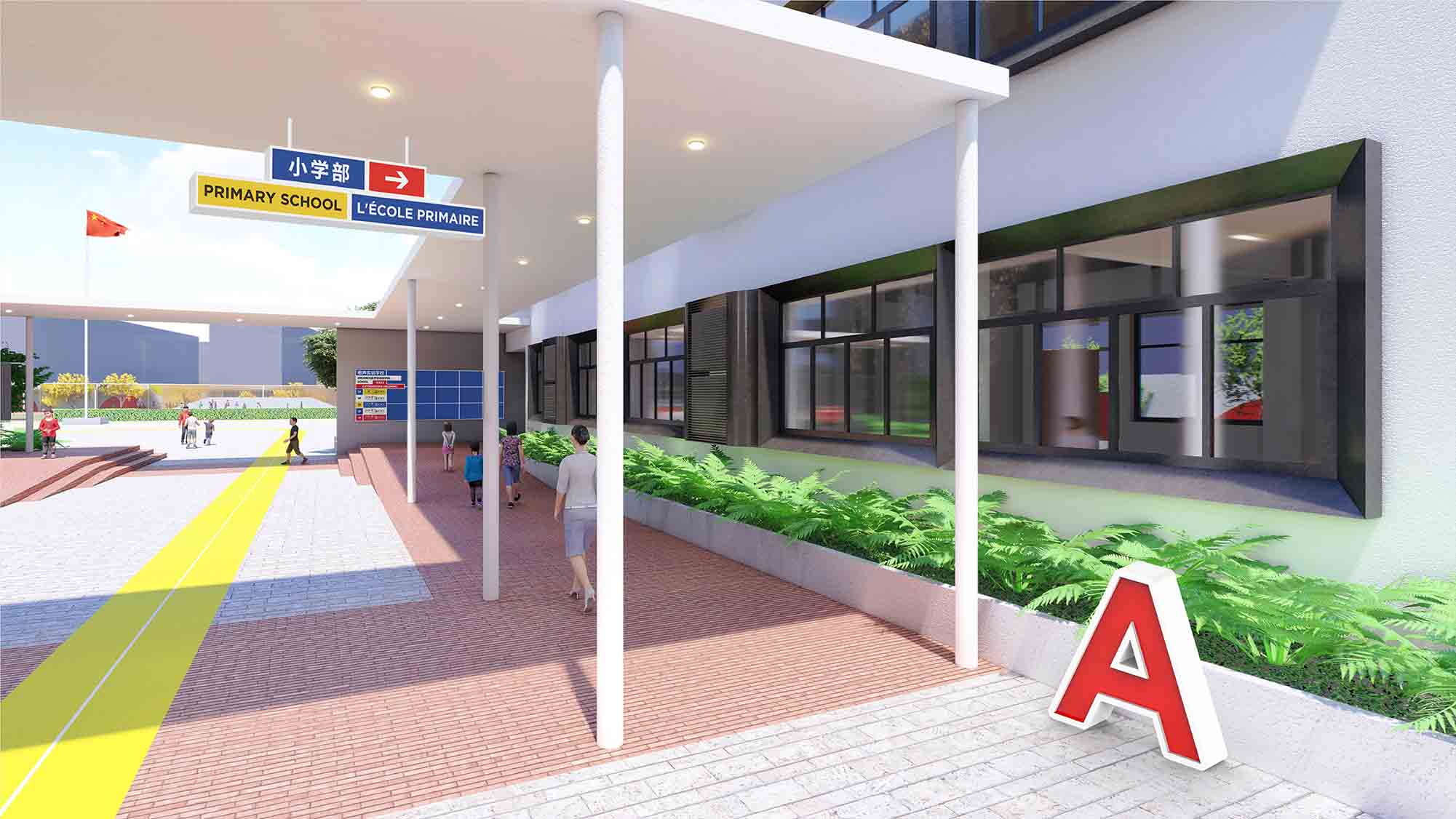 我们基于小学的中法背景,将中国和法国的国旗色彩元素提取出来,以色块叠拼的方式,组织出一套色彩鲜艳清晰,同时并不落入教育类建筑“红黄蓝”的套路化的色彩模式。在两个楼梯间,我们设计了随着楼梯而上的环境图形壁画,内容为和中法著名建筑和人文特色,希望同学们在学校上下楼之间也能直观并清晰的感受到其学校的文化及教学背景。