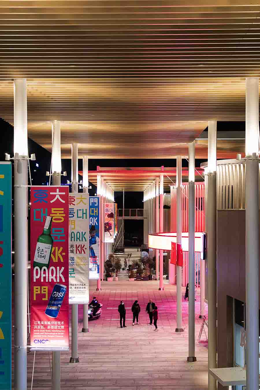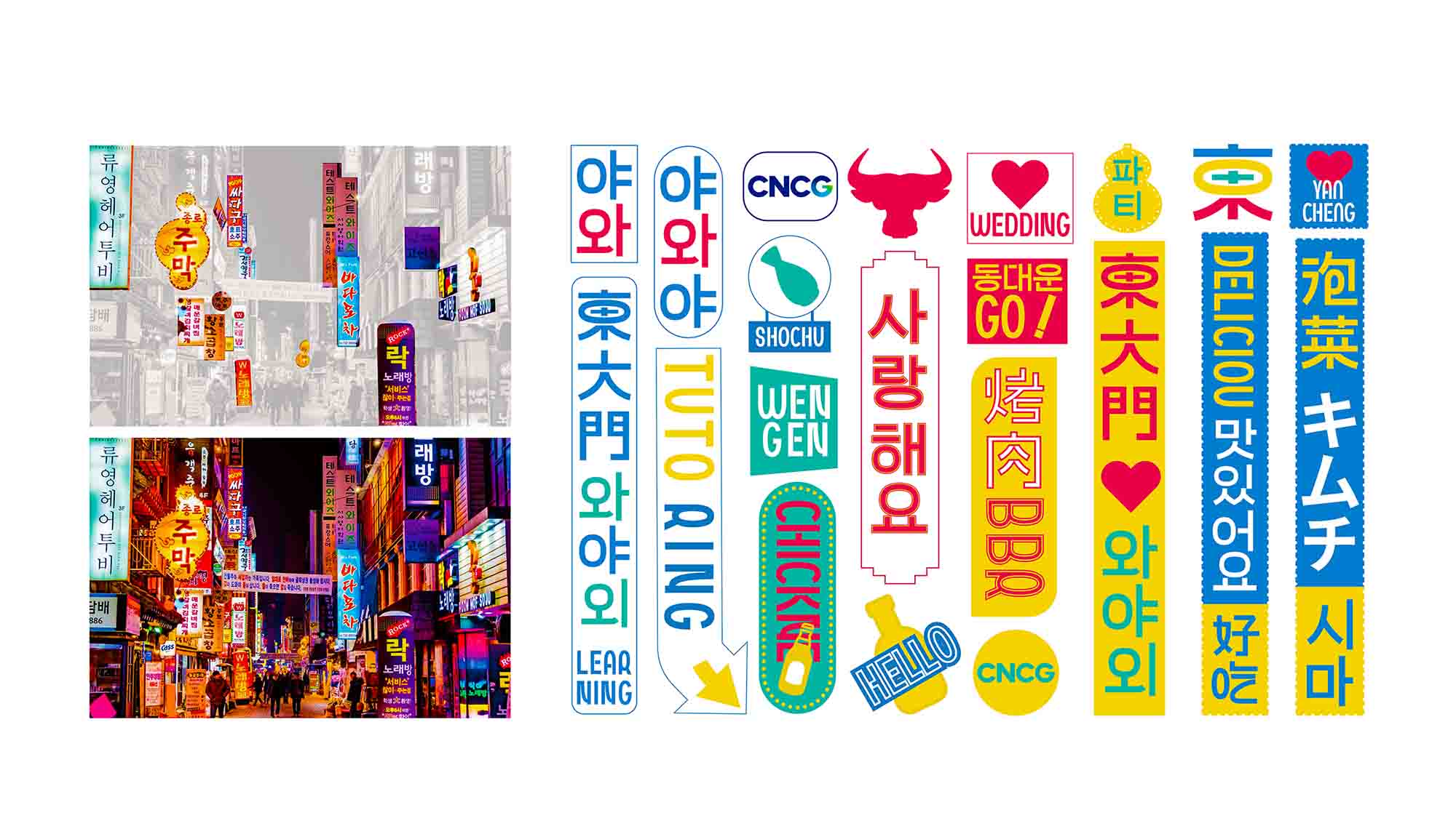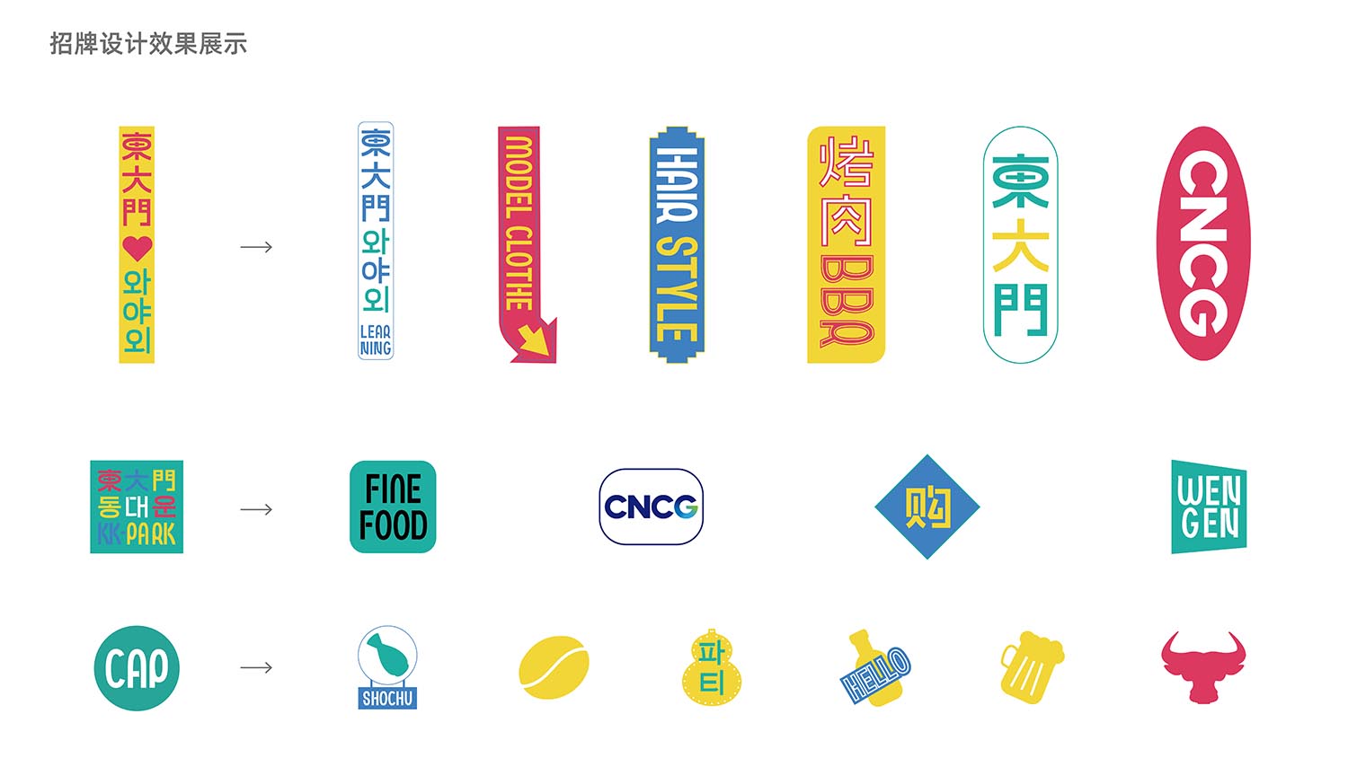 东大门所在的商业区域周边有众多韩国企业和工厂,覆盖数万常居韩国居民,因此本项目的定位之一,是打造一个具有韩国风情的商业街区。我们试图使用中文、英文和韩文的文字特征,打造一个视觉上同时接近中文、英文和韩文,或者说将文字间的形态区别略微模糊的综合视觉形象,以此将中国人和韩国人的文化背景同时带入。
